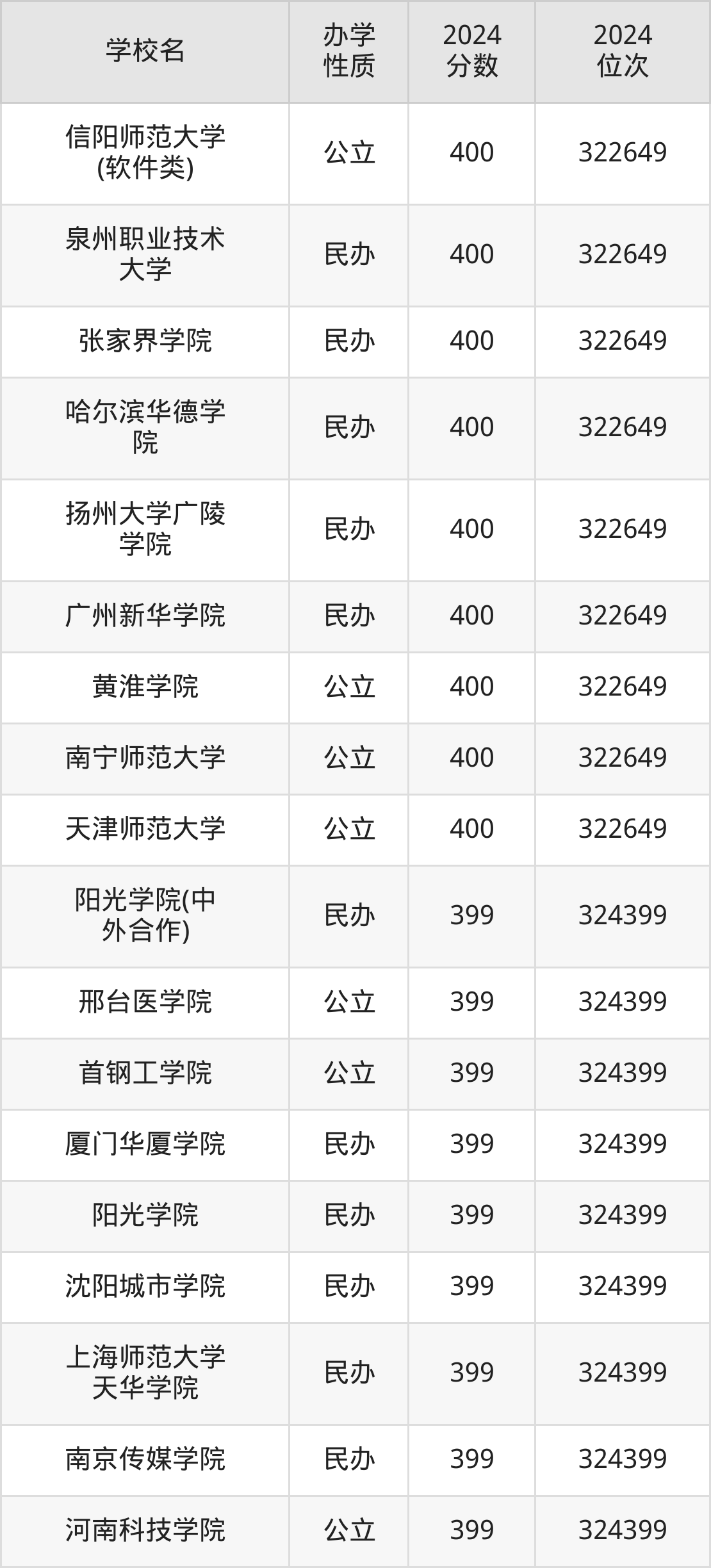 | 阳光学院(中 外合作) | 399 | 324399 |