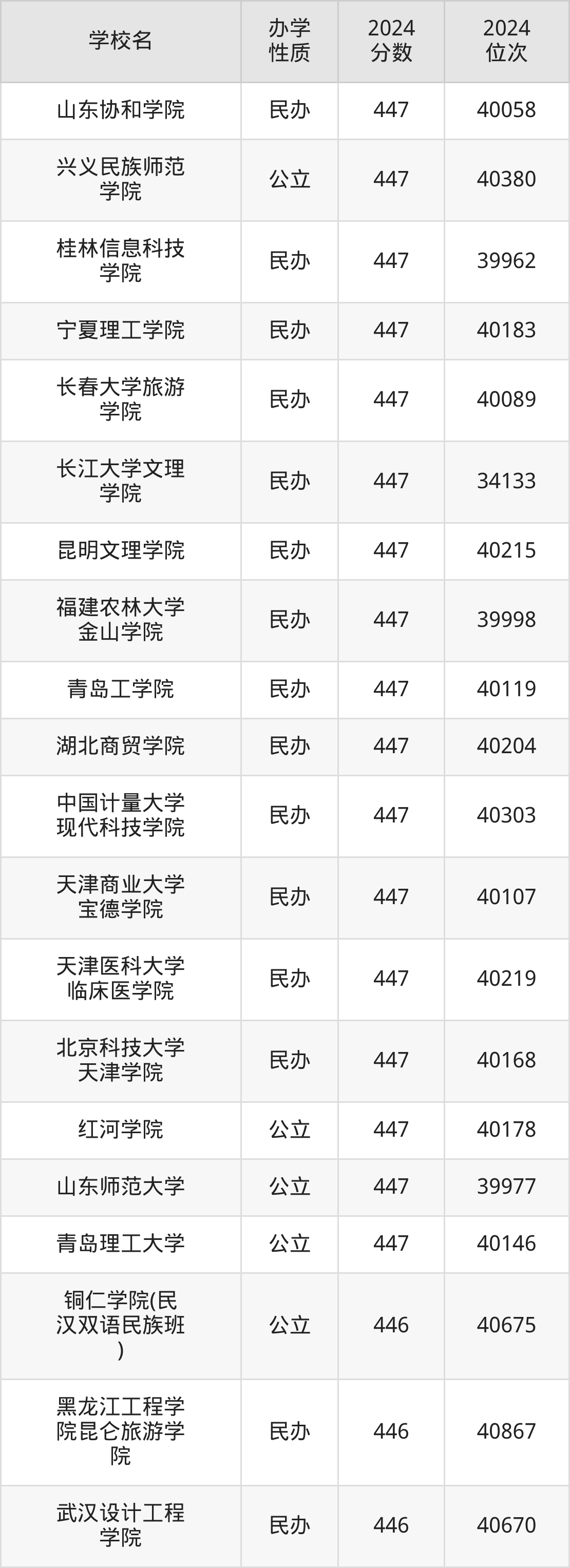 贵州447分左右的考生可以上六盘水师范学院(民汉双语预科班)、广西城市职业大学、上海兴伟学院等院校,刚好在447分的院校有哈尔滨信息工程学院、南通理工学院、南昌工学院等。