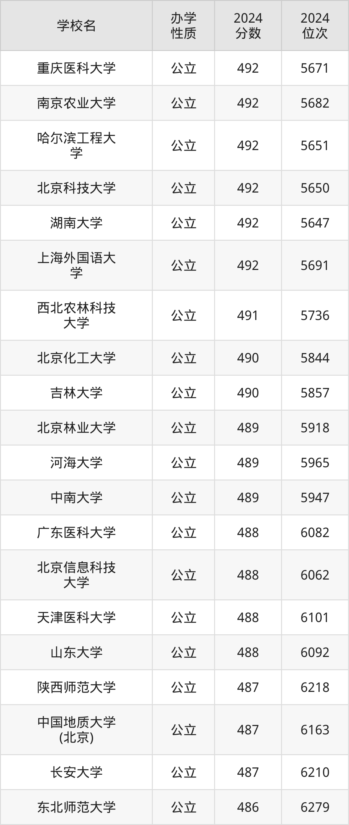 宁夏487分左右的考生可以上重庆医科大学、南京农业大学、哈尔滨工程大学等院校,刚好在487分的院校有陕西师范大学、中国地质大学(北京)、长安大学。