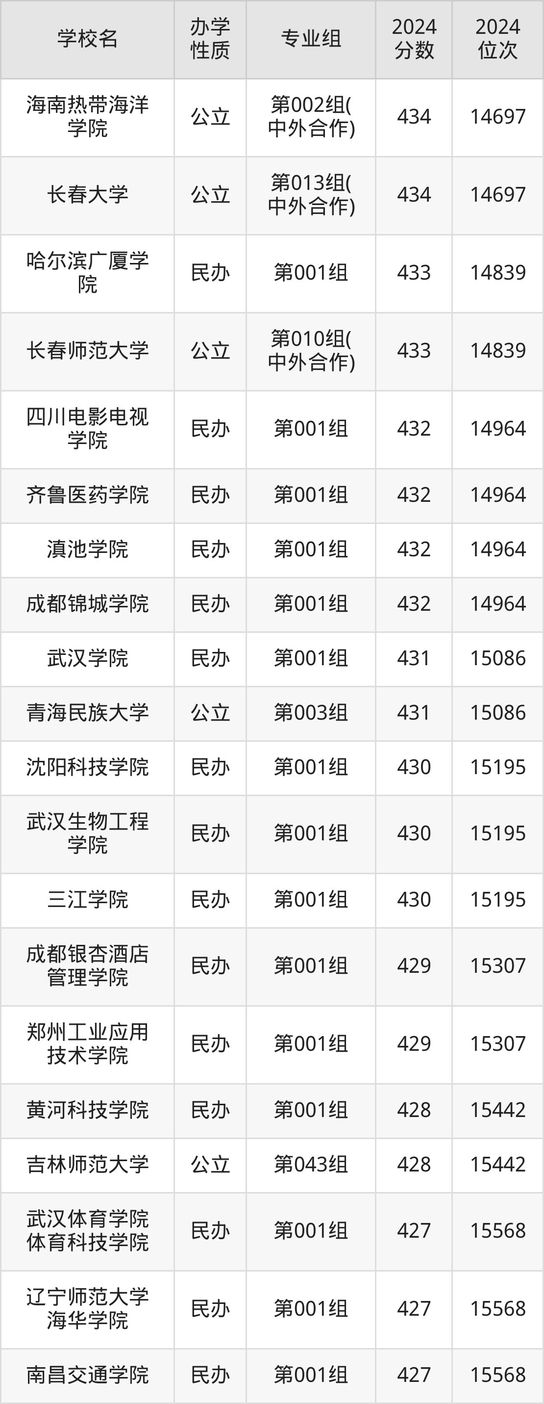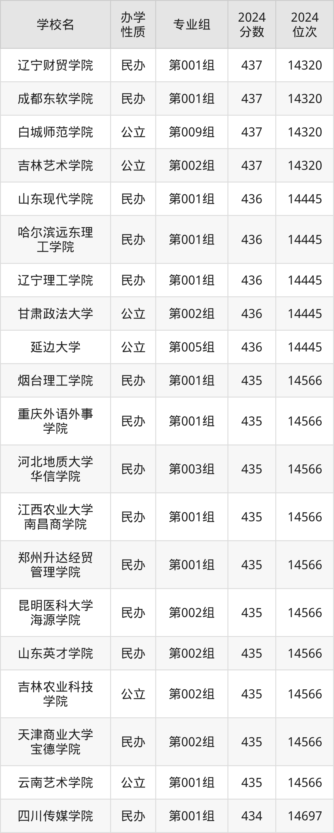 2024年吉林历史类432分考生能上辽宁财贸学院、成都东软学院、白城师范学院、吉林艺术学院、山东现代学院等40所二本院校,具体录取分数线及位次为:
