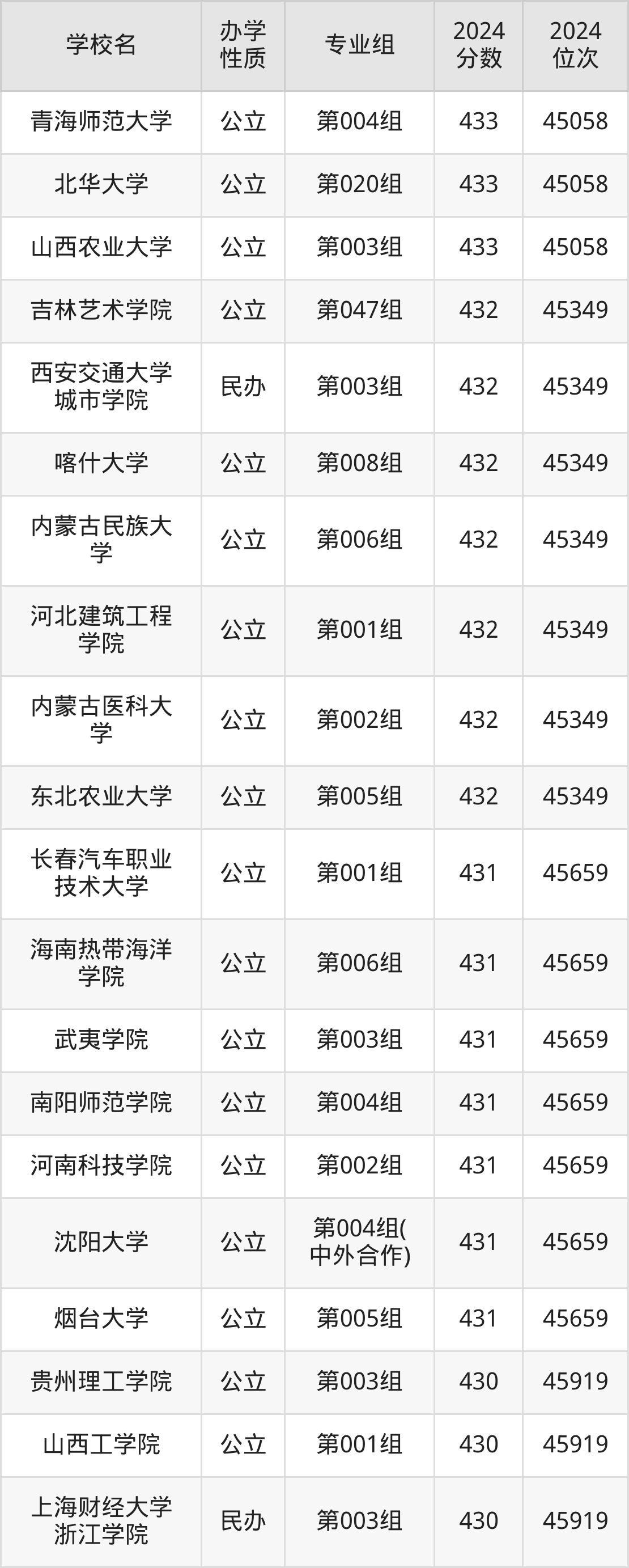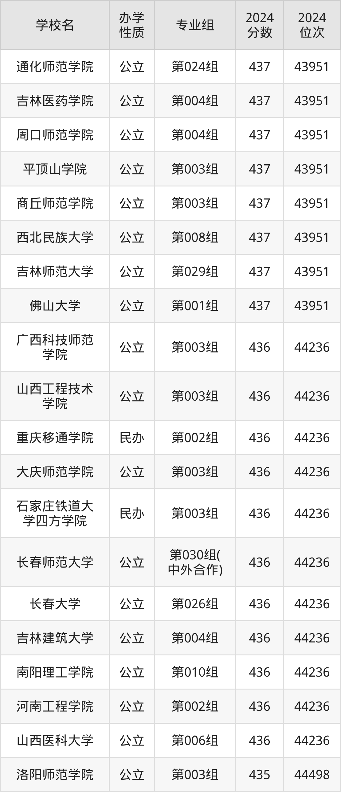 2024年吉林物理类432分考生能上通化师范学院、吉林医药学院、周口师范学院、平顶山学院、商丘师范学院等89所二本院校,具体录取分数线及位次为: