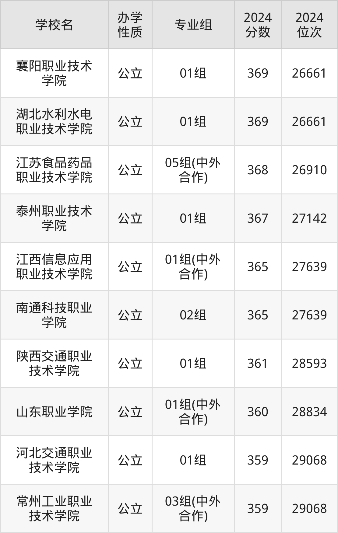 2024年江苏历史类364分考生能上襄阳职业技术学院、湖北水利水电职业技术学院、江苏食品药品职业技术学院、泰州职业技术学院、江西信息应用职业技术学院等10所专科院校,具体录取分数线及位次为: