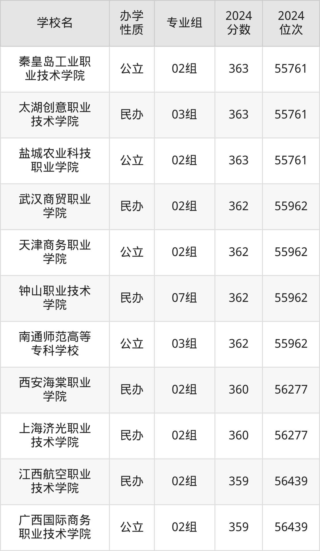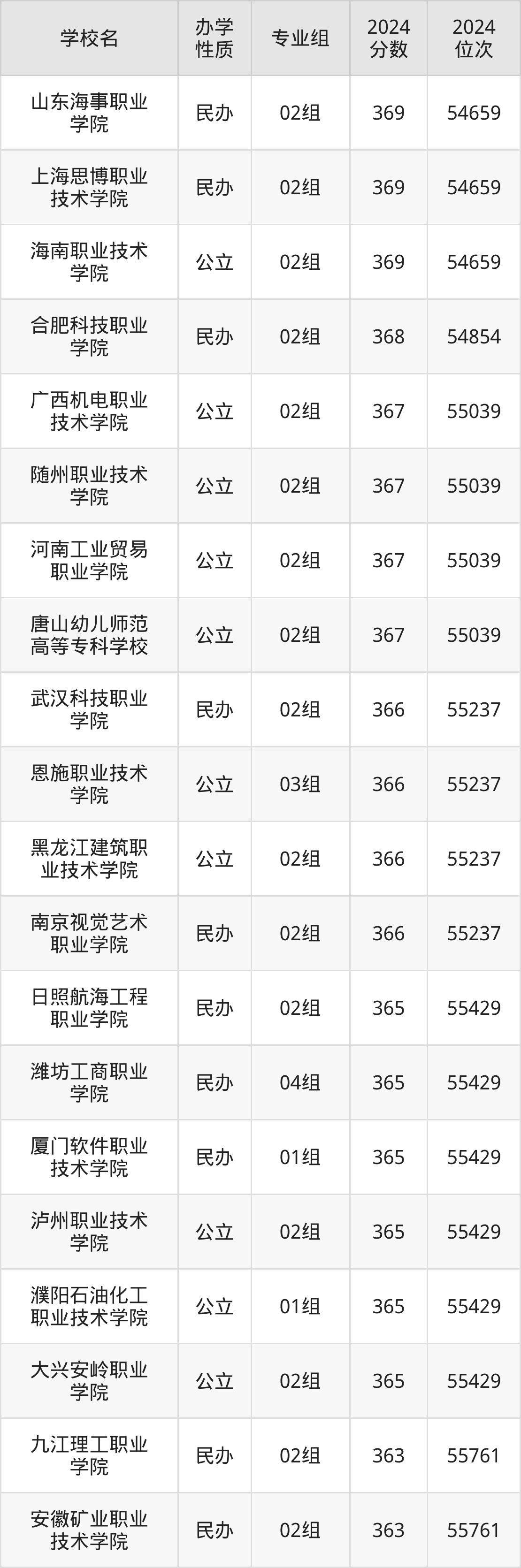 2024年江苏物理类364分考生能上山东海事职业学院、上海思博职业技术学院、海南职业技术学院、合肥科技职业学院、广西机电职业技术学院等31所专科院校,具体录取分数线及位次为: