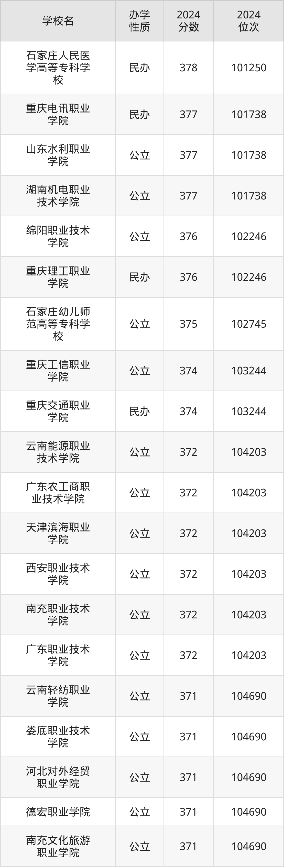 | 南充文化旅游 职业学院 | 371 | 104690 |