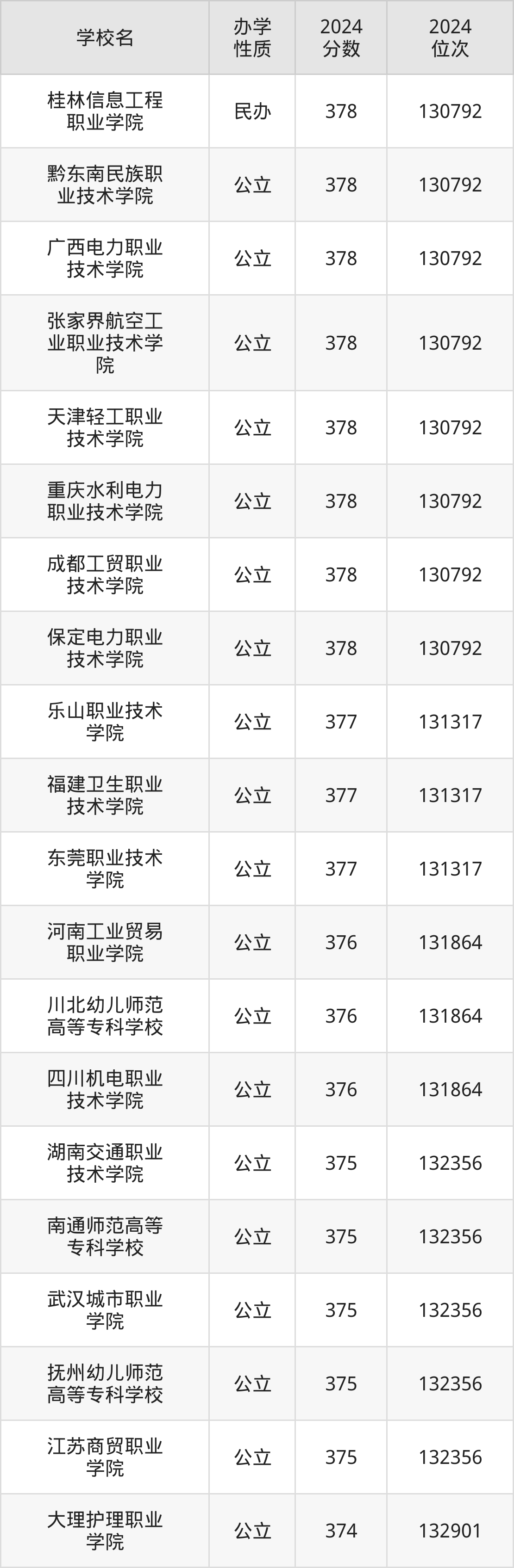 | 黔东南民族职 业技术学院 | 378 | 130792 |