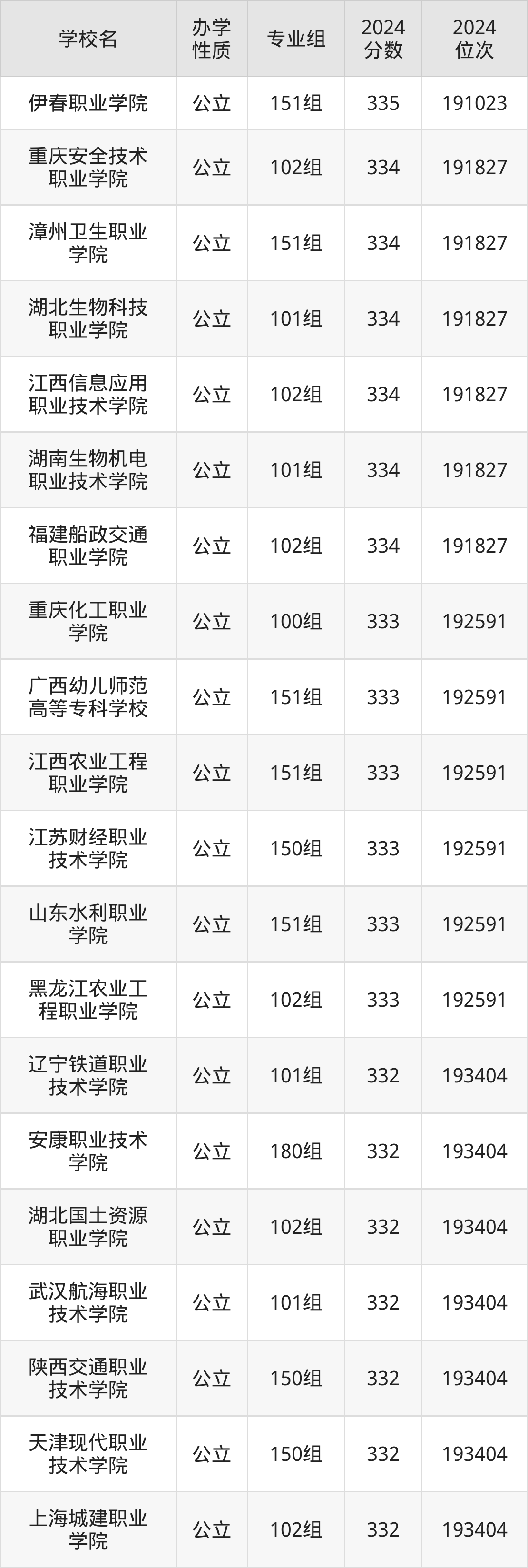 2024年广西物理类330分考生能上伊春职业学院、重庆安全技术职业学院、漳州卫生职业学院、湖北生物科技职业学院、江西信息应用职业技术学院等57所专科院校,具体录取分数线及位次为: