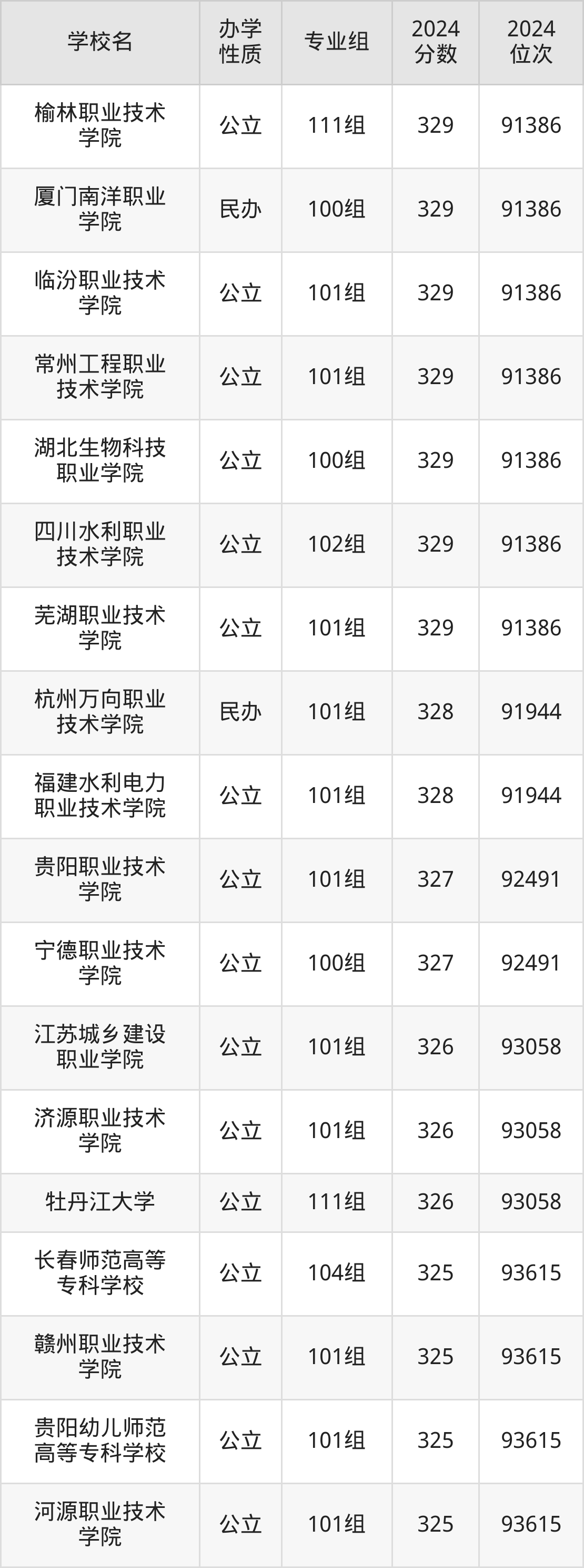 | 福建水利电力 职业技术学院 | 102组 | 329 | 195744 |