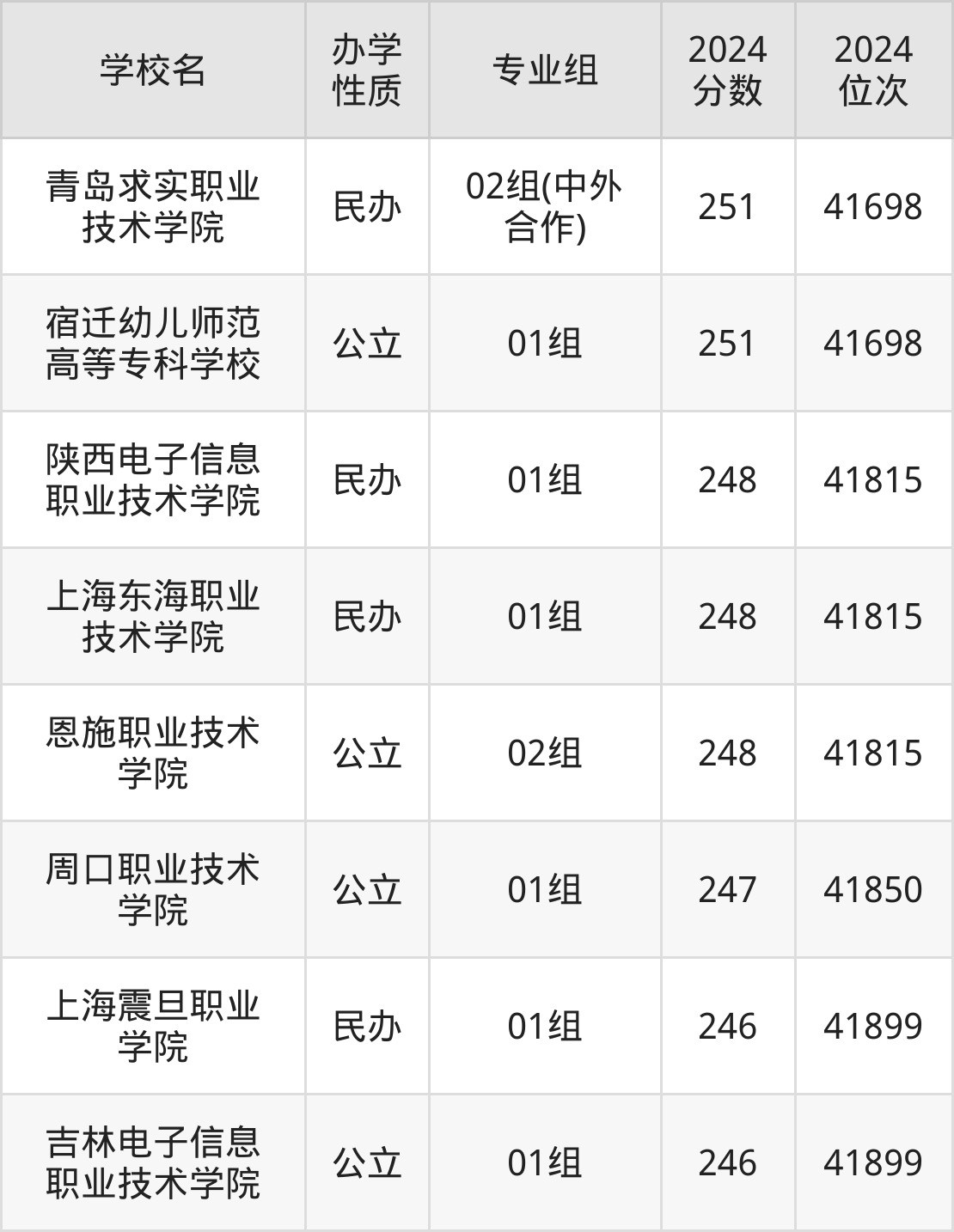 2024年江苏历史类248分考生能上青岛求实职业技术学院、宿迁幼儿师范高等专科学校、陕西电子信息职业技术学院、上海东海职业技术学院、恩施职业技术学院等8所专科院校,具体录取分数线及位次为: