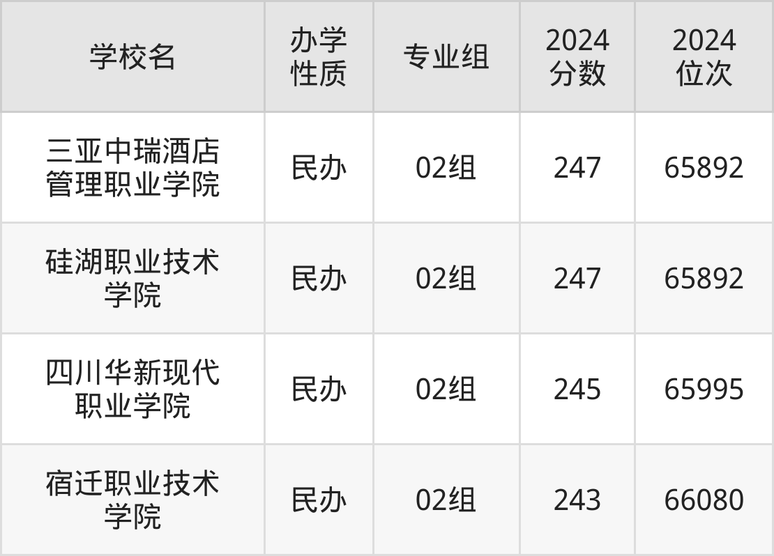 2024年江苏物理类248分考生能上三亚中瑞酒店管理职业学院、硅湖职业技术学院、四川华新现代职业学院、宿迁职业技术学院4所专科院校,具体录取分数线及位次为: