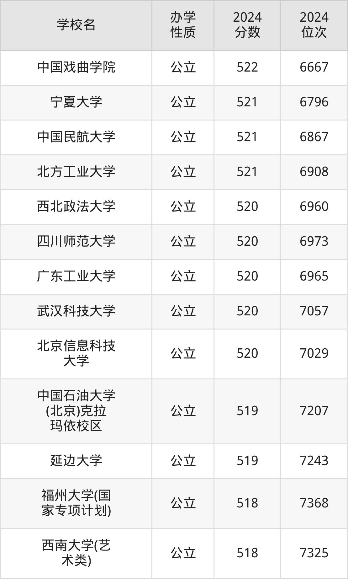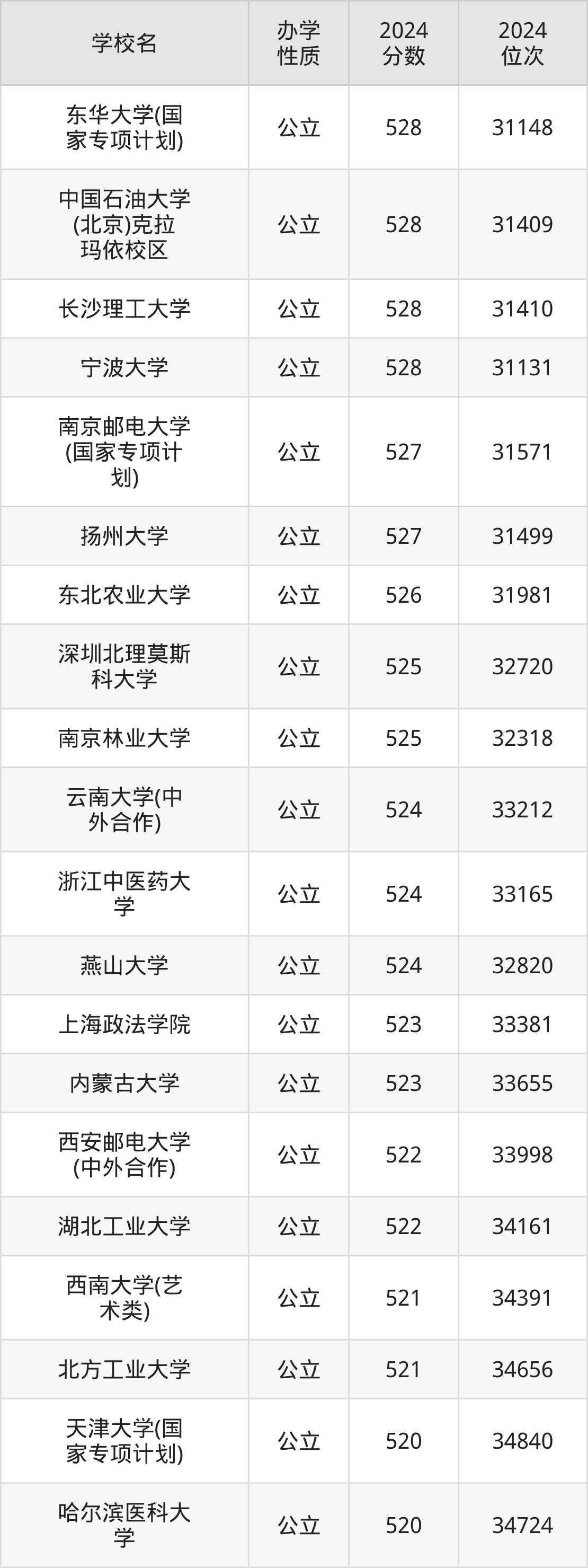 2024年陕西理科523分考生能上东华大学(国家专项计划)、中国石油大学(北京)克拉玛依校区、长沙理工大学、宁波大学、南京邮电大学(国家专项计划)等25所一本院校,具体录取分数线及位次为: