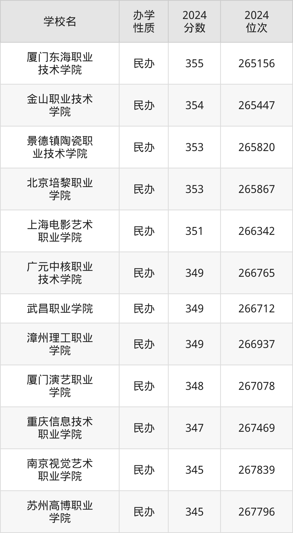 2024年浙江350分考生能上厦门东海职业技术学院、金山职业技术学院、景德镇陶瓷职业技术学院、北京培黎职业学院、上海电影艺术职业学院等12所专科院校,具体录取分数线及位次为: