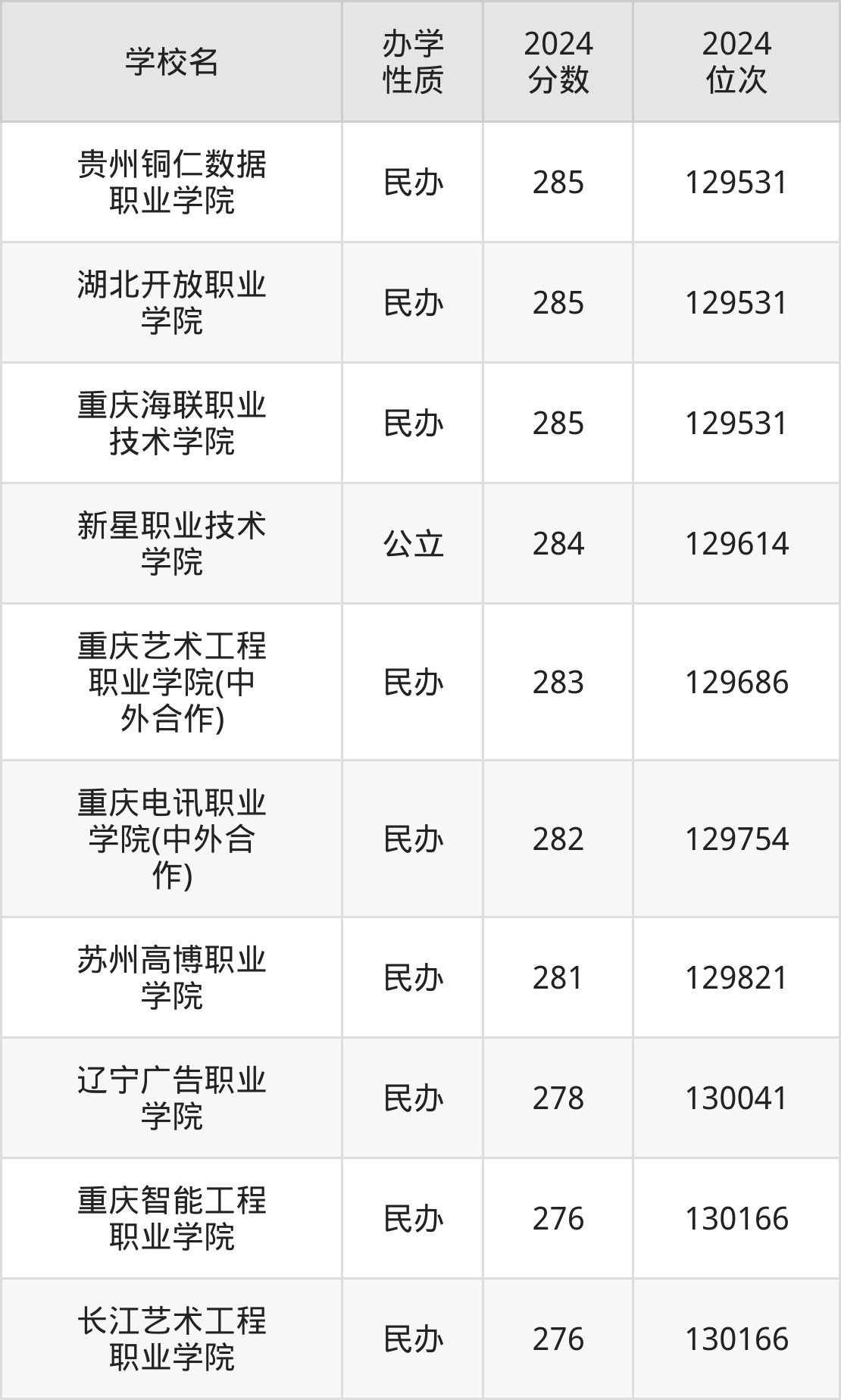 2024年重庆物理类281分考生能上贵州铜仁数据职业学院、湖北开放职业学院、重庆海联职业技术学院、新星职业技术学院、重庆艺术工程职业学院(中外合作)等10所专科院校,具体录取分数线及位次为: