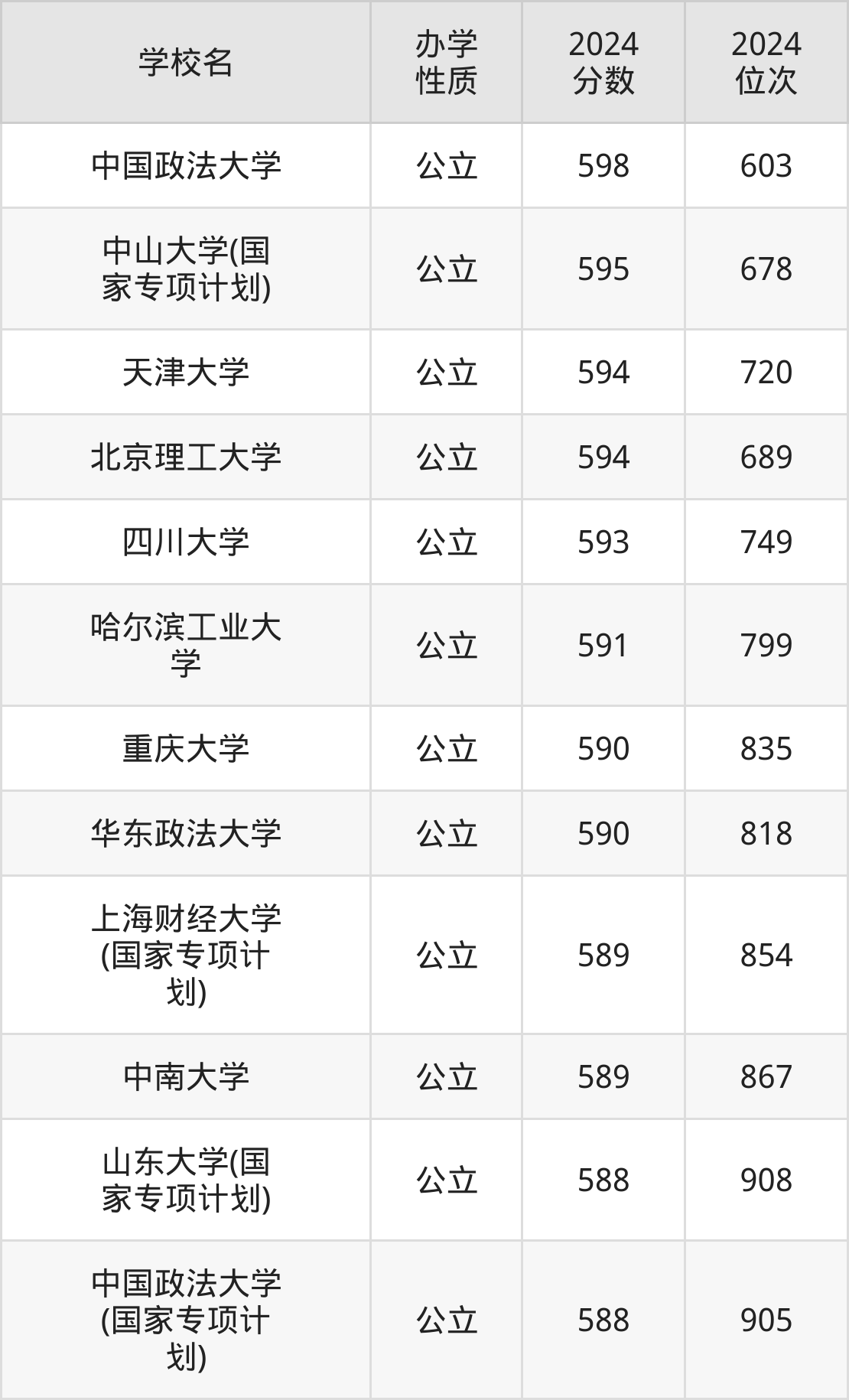 2024年陕西文科593分考生能上中南大学、重庆大学、哈尔滨工业大学、四川大学、北京理工大学等6所985院校,具体录取分数线及位次为: