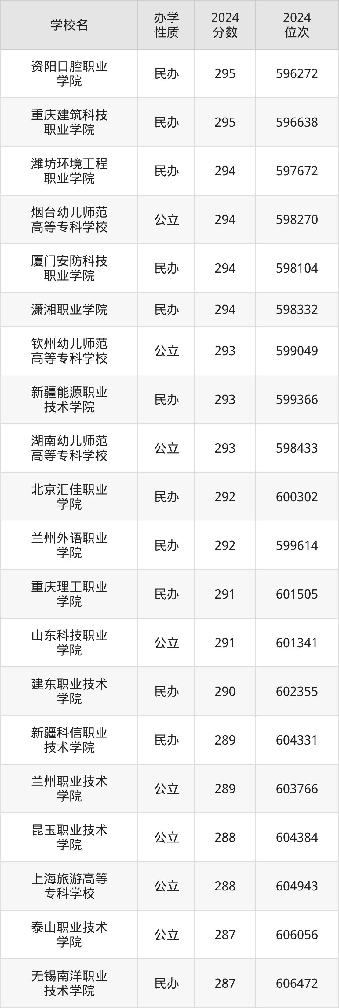 2024年山东290分考生能上资阳口腔职业学院、重庆建筑科技职业学院、潍坊环境工程职业学院、烟台幼儿师范高等专科学校、厦门安防科技职业学院等27所专科院校,具体录取分数线及位次为: