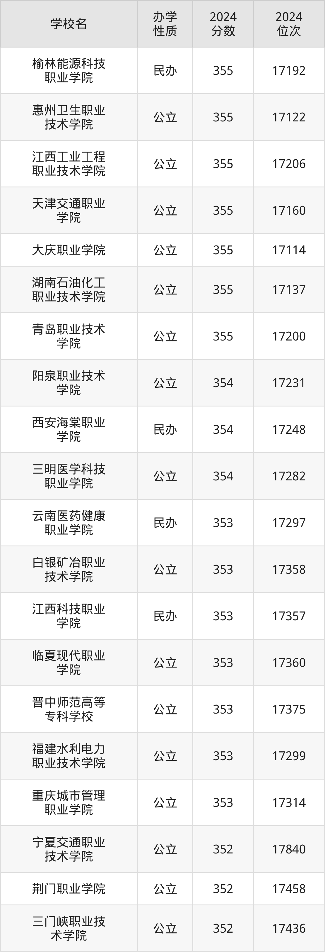 | 榆林能源科技 职业学院 | 355 | 17192 |