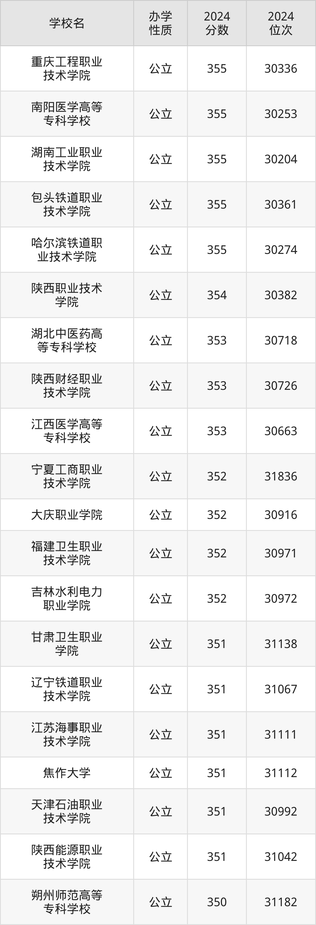 2024年宁夏理科350分考生能上重庆工程职业技术学院、南阳医学高等专科学校、湖南工业职业技术学院、包头铁道职业技术学院、哈尔滨铁道职业技术学院等44所专科院校,具体录取分数线及位次为: