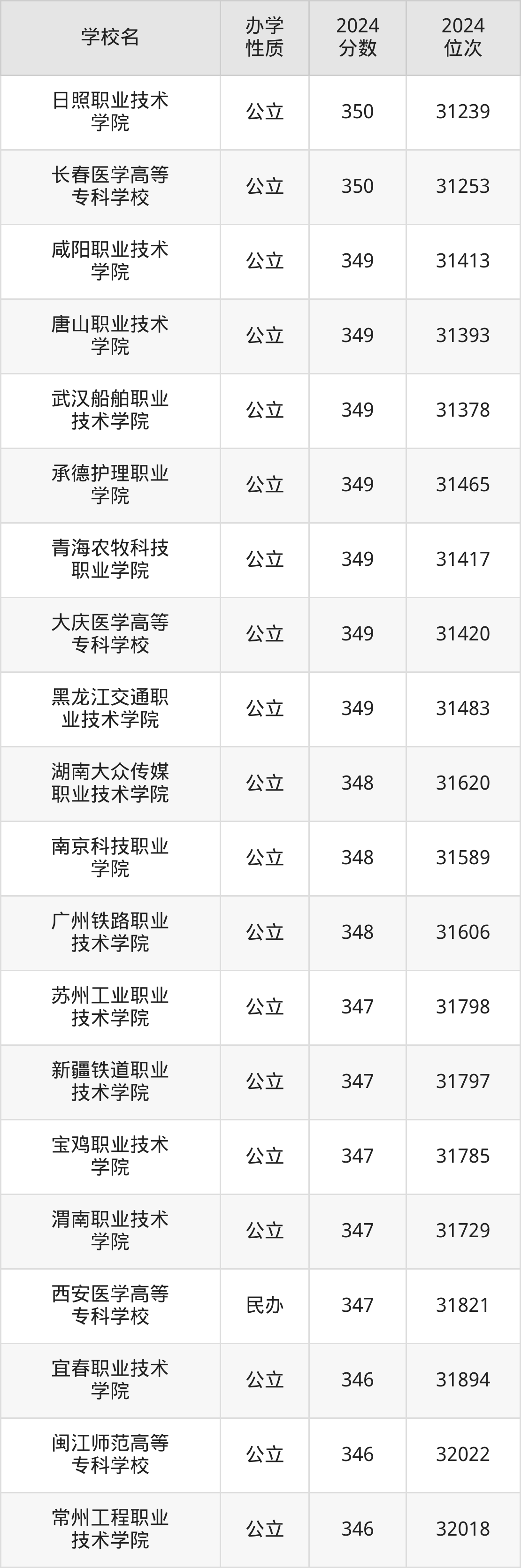 | 长春医学高等 专科学校 | 350 | 31253 |