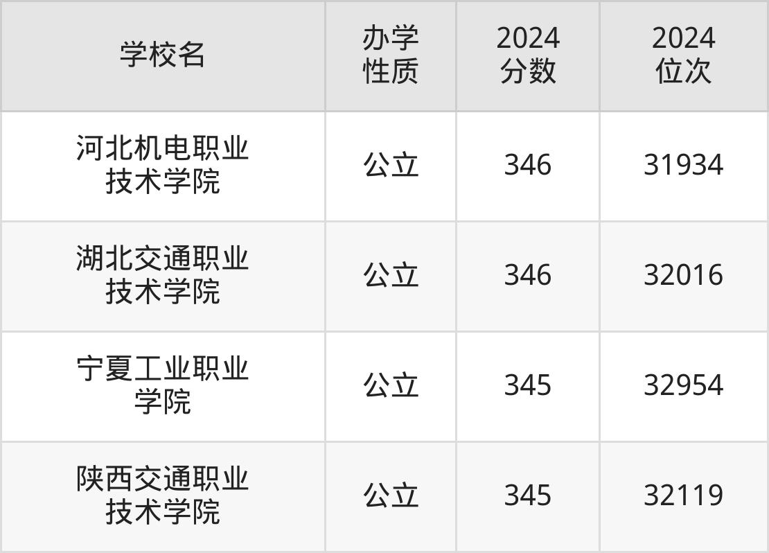 | 陕西交通职业 技术学院 | 345 | 32119 |