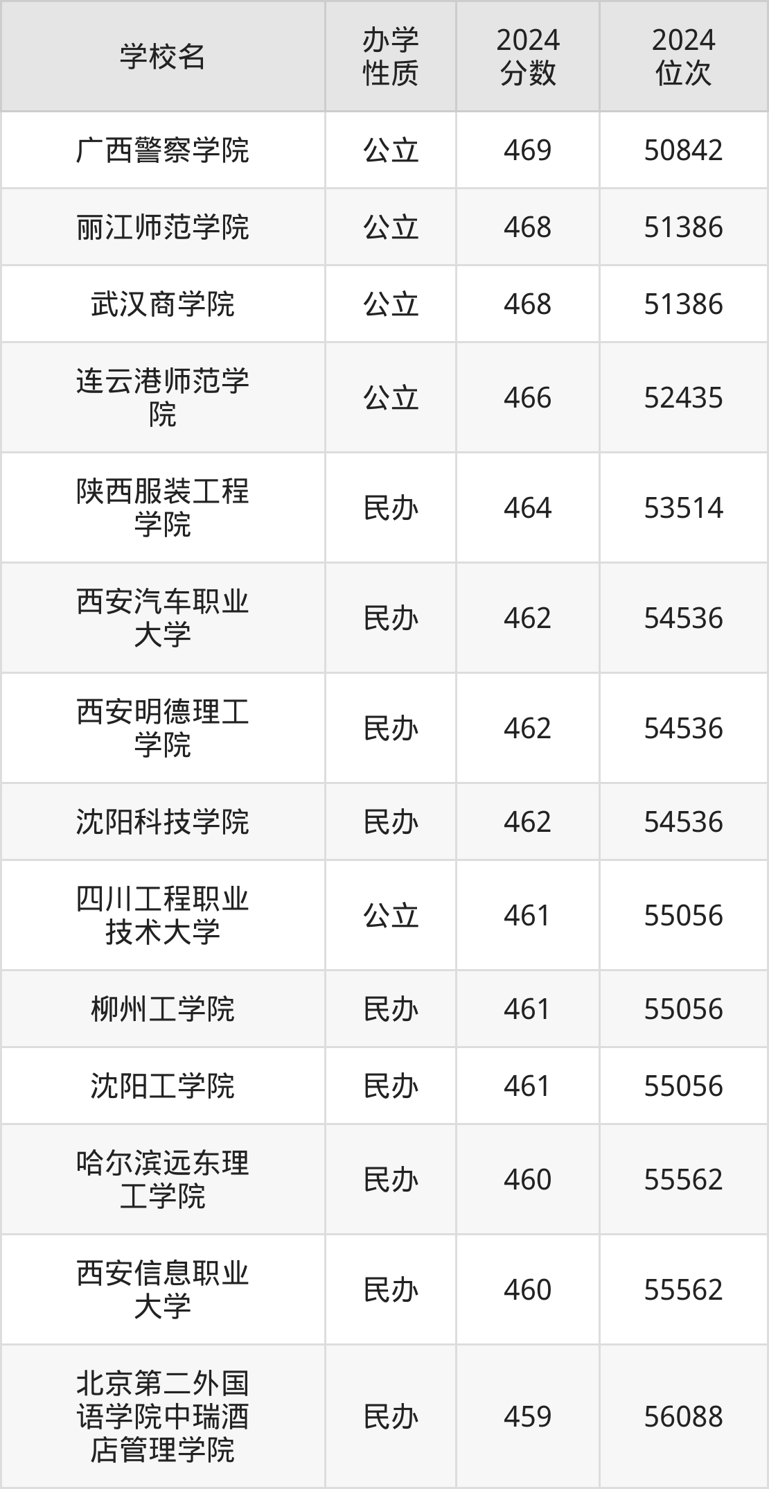 2024年云南文科464分考生能上陕西服装工程学院、西安汽车职业大学、西安明德理工学院、沈阳科技学院、柳州工学院等9所二本院校,具体录取分数线及位次为:
