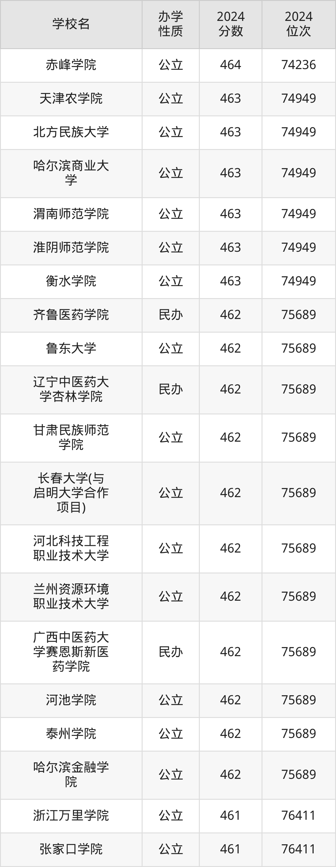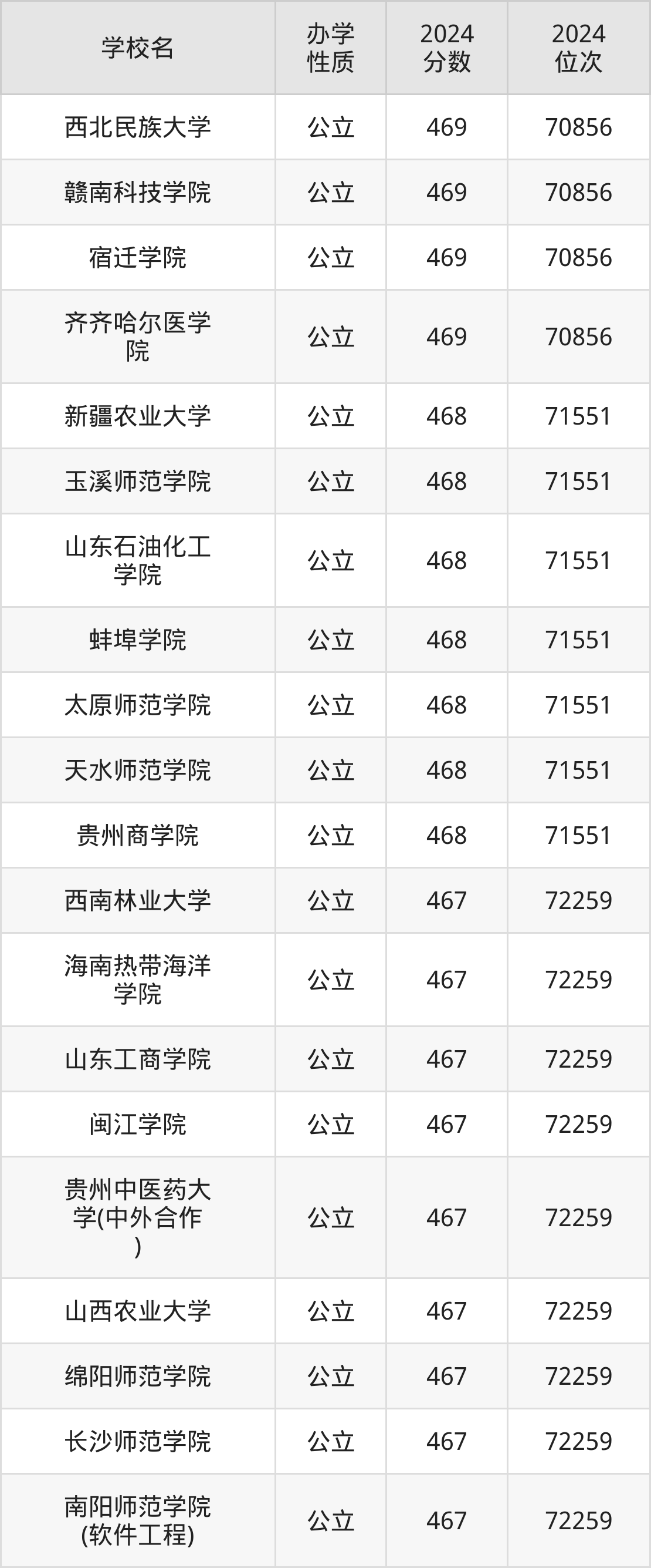 2024年云南理科464分考生能上西北民族大学、赣南科技学院、宿迁学院、齐齐哈尔医学院、新疆农业大学等86所二本院校,具体录取分数线及位次为: