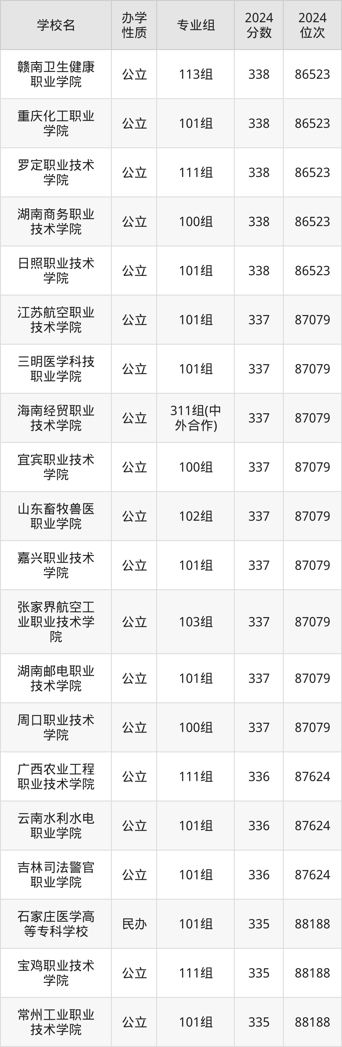 2024年广西历史类333分考生能上赣南卫生健康职业学院、重庆化工职业学院、罗定职业技术学院、湖南商务职业技术学院、日照职业技术学院等45所专科院校,具体录取分数线及位次为: