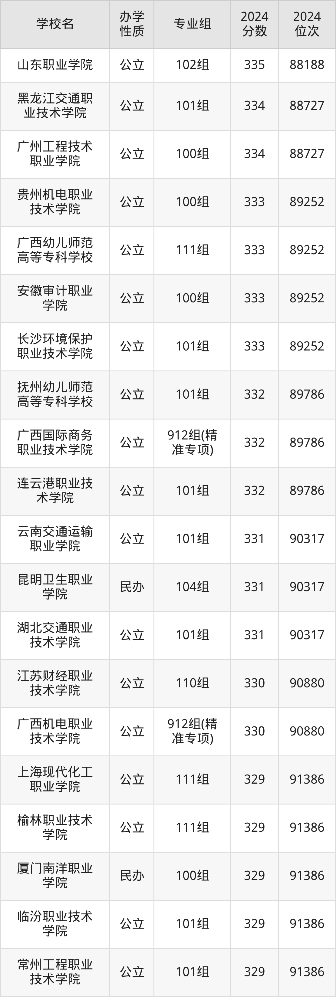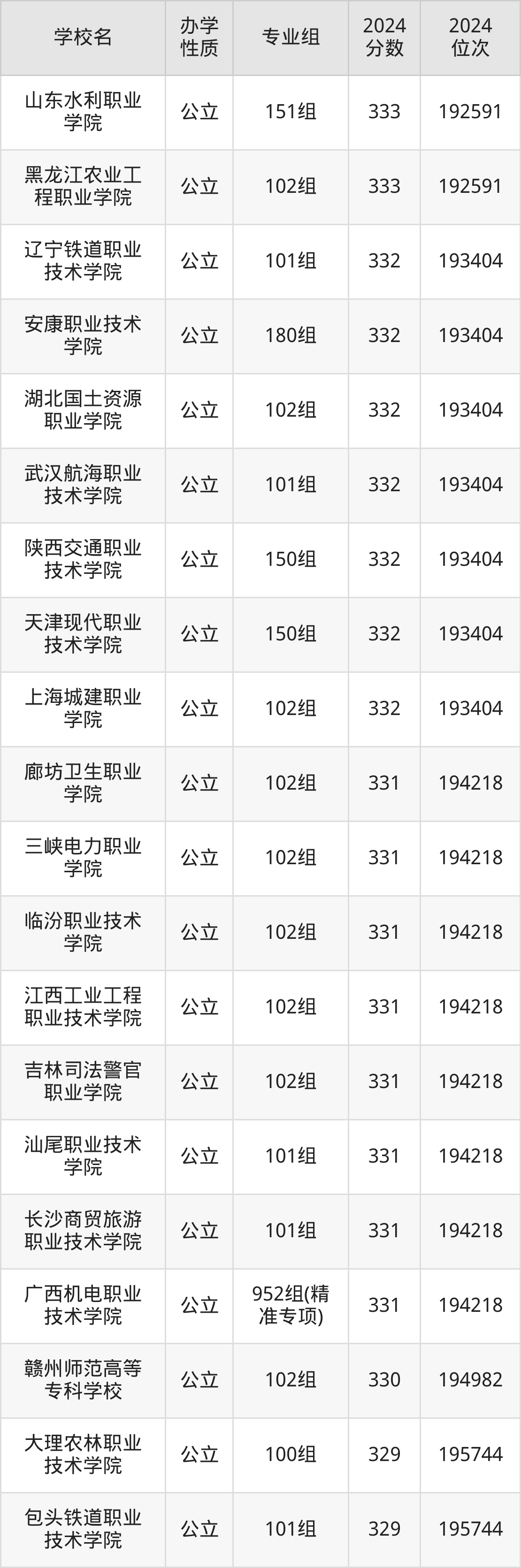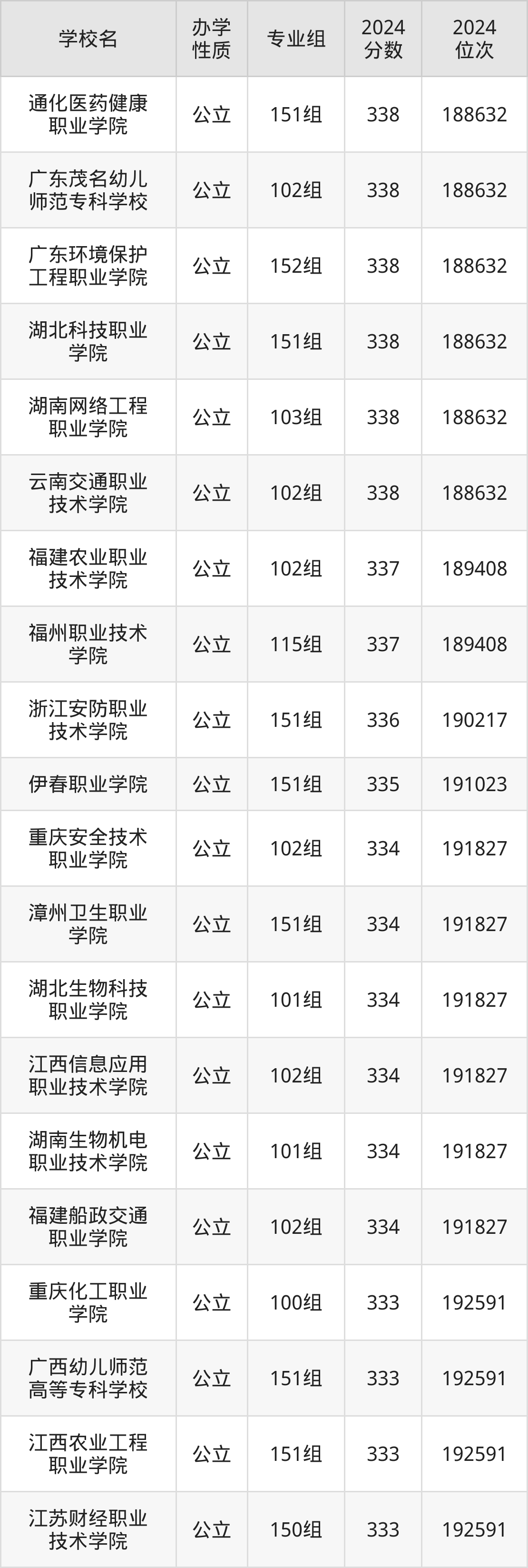 2024年广西物理类333分考生能上通化医药健康职业学院、广东茂名幼儿师范专科学校、广东环境保护工程职业学院、湖北科技职业学院、湖南网络工程职业学院等51所专科院校,具体录取分数线及位次为: