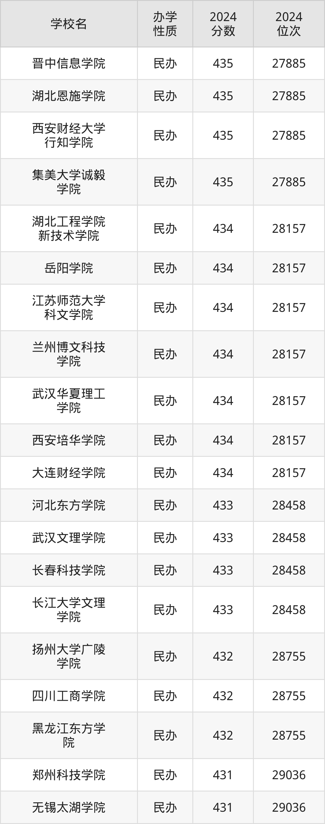 | 西安财经大学 行知学院 | 435 | 27885 |