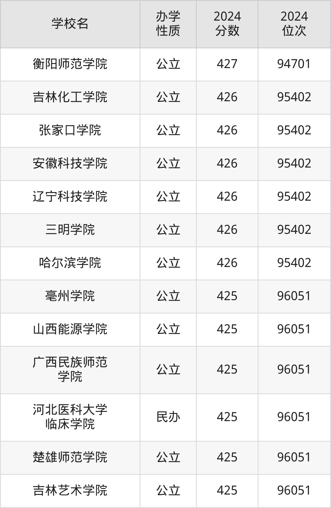 | 张家口学院 | 426 | 95402 |