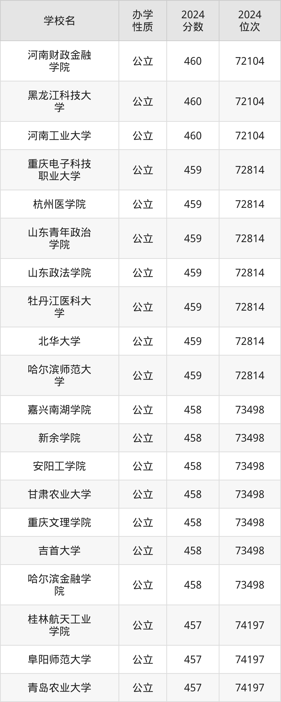| 河南财政金融 学院 | 460 | 72104 |