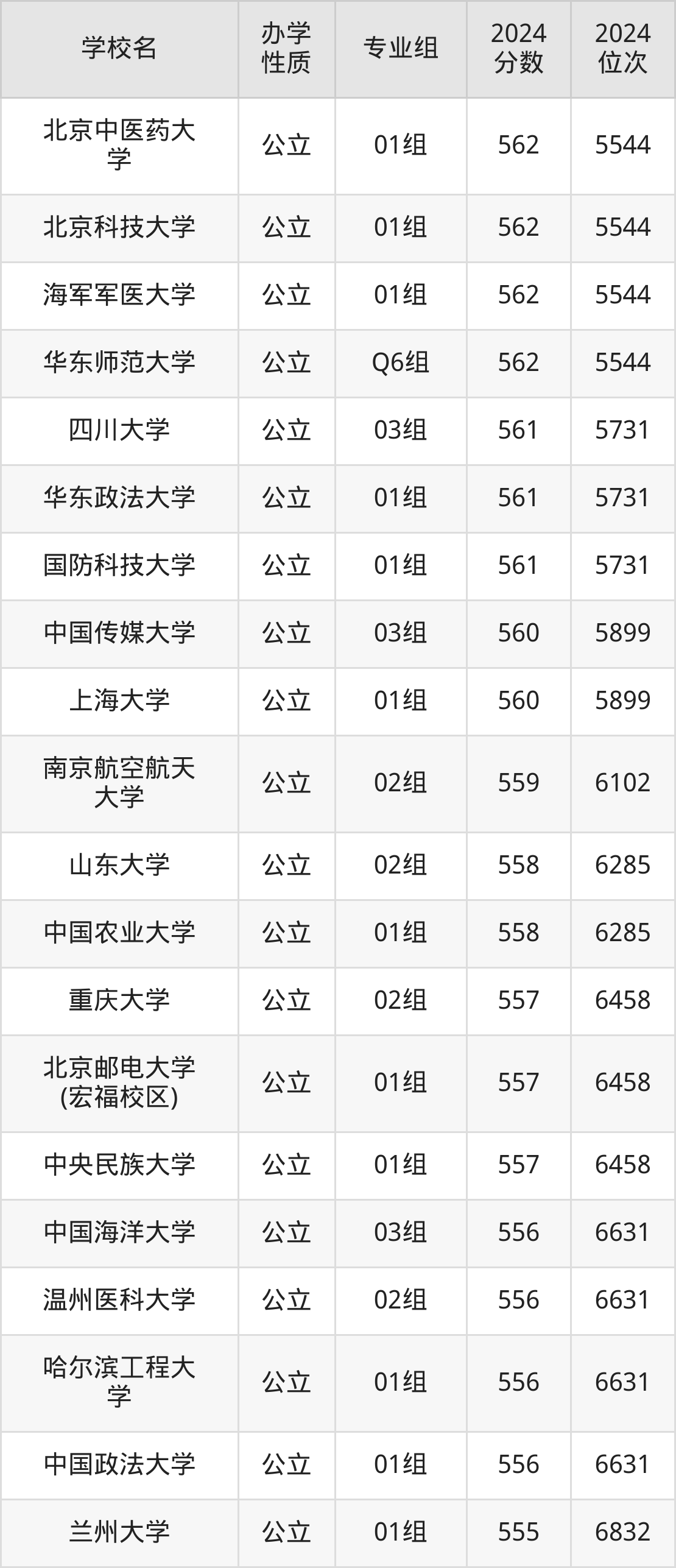 | 海军军医大学 | 01组 | 562 | 5544 |