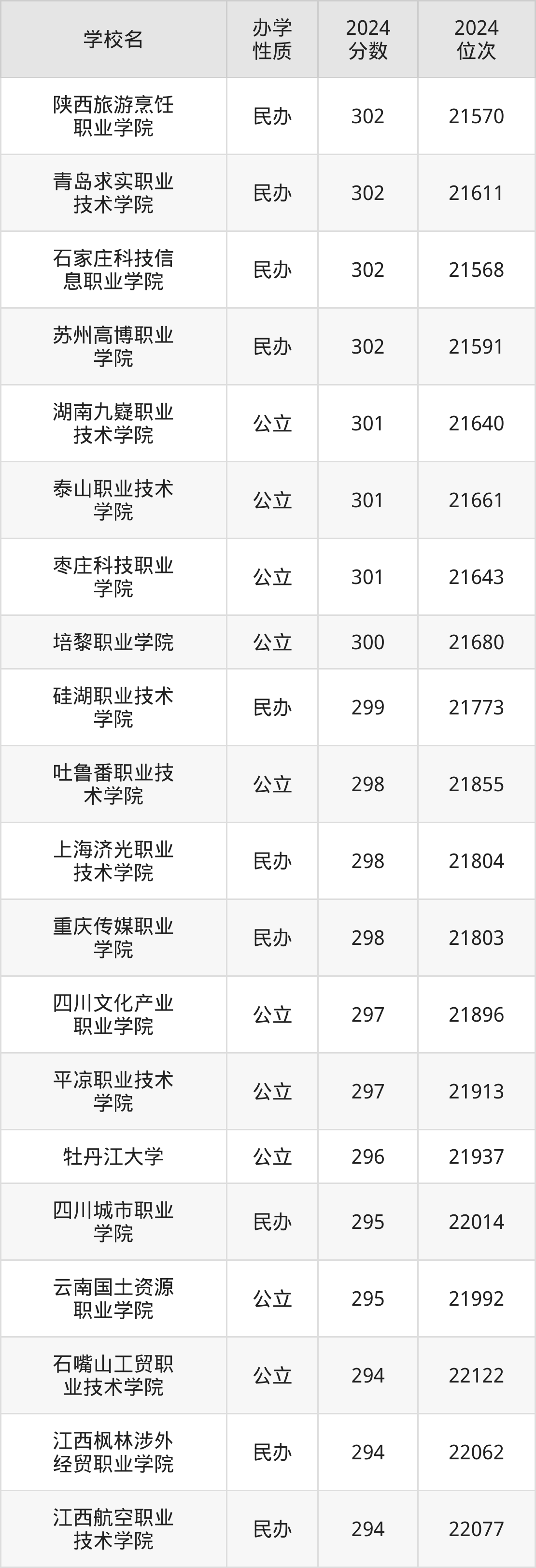 2024年宁夏文科297分考生能上陕西旅游烹饪职业学院、青岛求实职业技术学院、石家庄科技信息职业学院、苏州高博职业学院、湖南九嶷职业技术学院等22所专科院校,具体录取分数线及位次为: