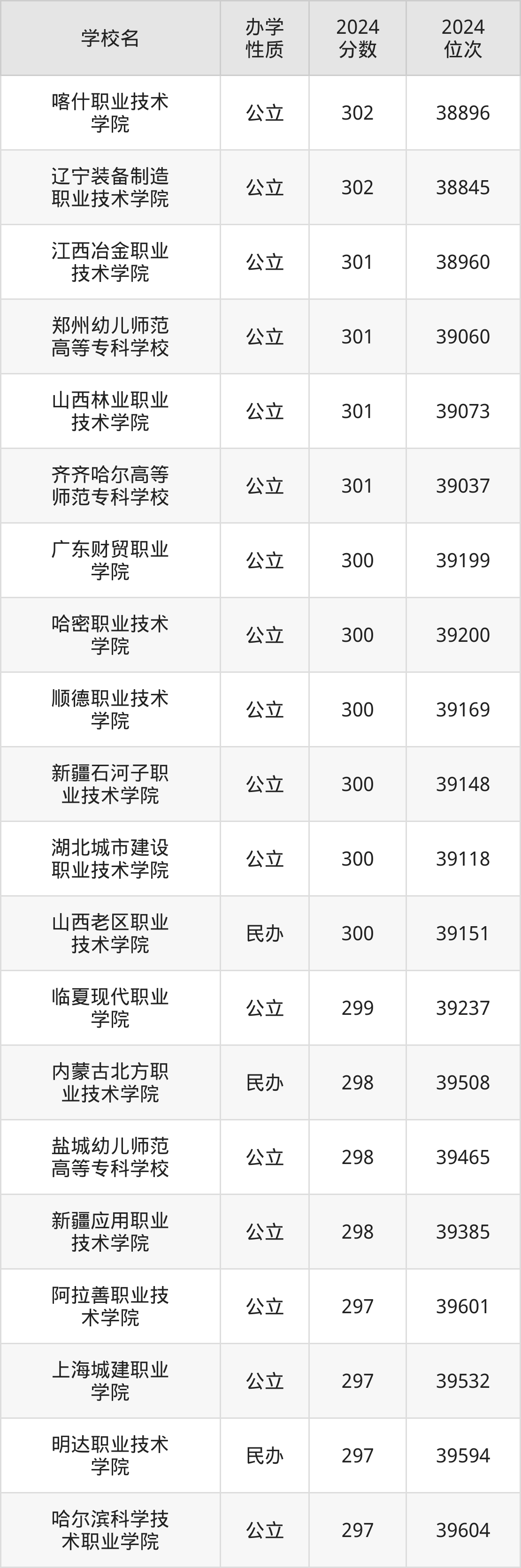 2024年宁夏理科297分考生能上喀什职业技术学院、辽宁装备制造职业技术学院、江西冶金职业技术学院、郑州幼儿师范高等专科学校、山西林业职业技术学院等25所专科院校,具体录取分数线及位次为: