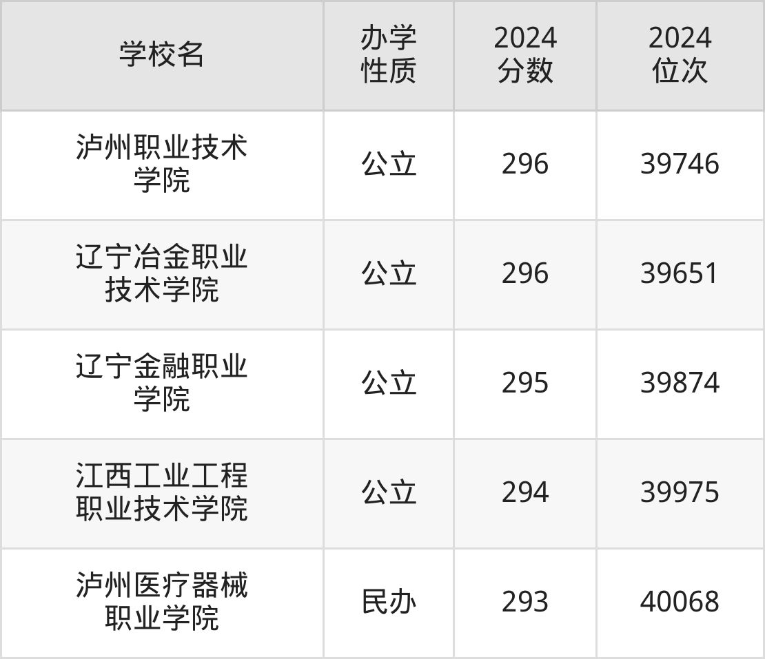 | 泸州医疗器械 职业学院 | 293 | 40068 |