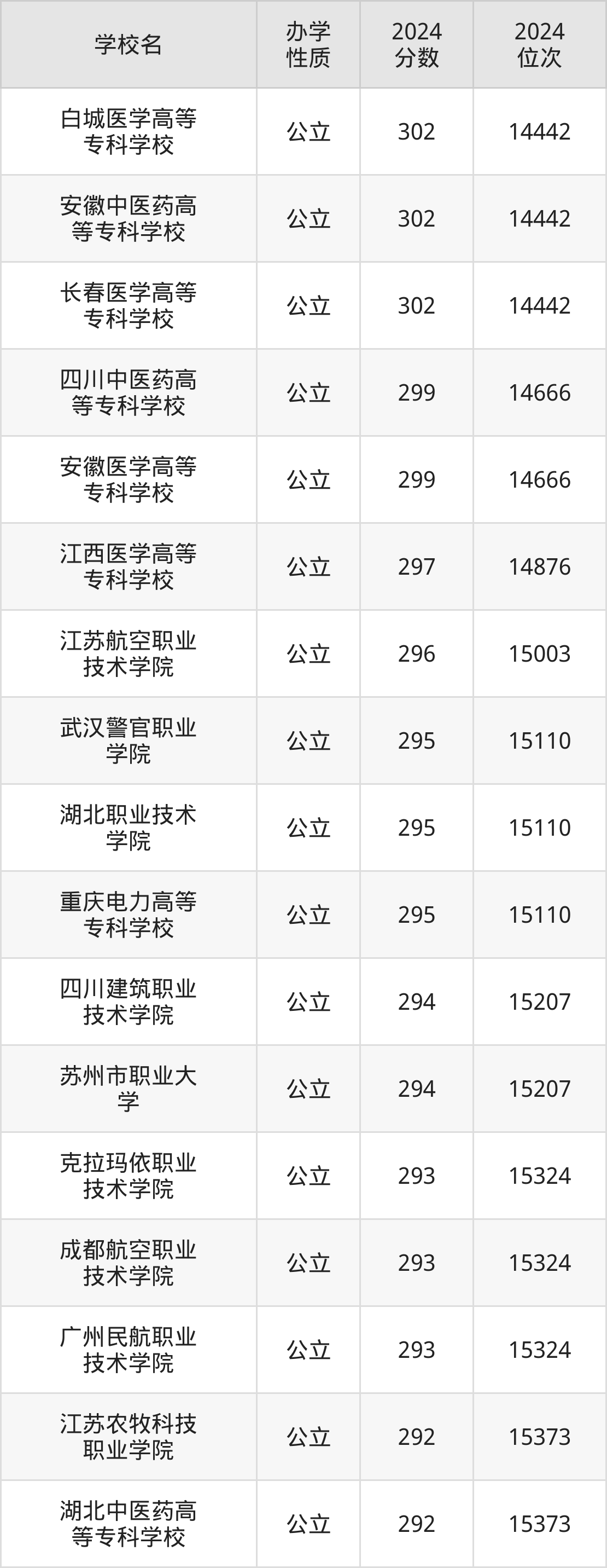 | 长春医学高等 专科学校 | 302 | 14442 |
