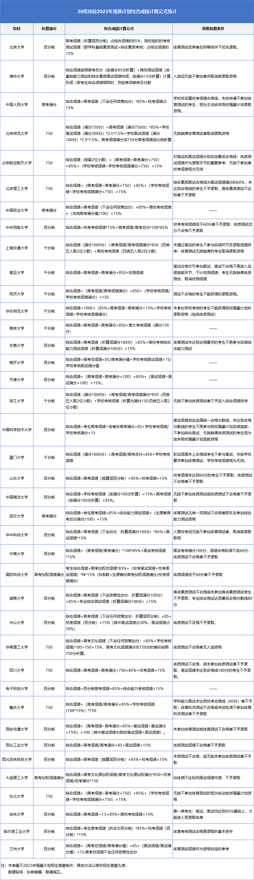 统计2023年高校强基计划招生简章,虽然计算公式五花八门,但比例都一致,高校均为高考成绩85%+校测15%的比例。