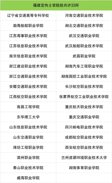 共有33所院校在福建招收定向士官,均为省外高校,包含了滨州职业学院、湖南汽车工程职业学院等。