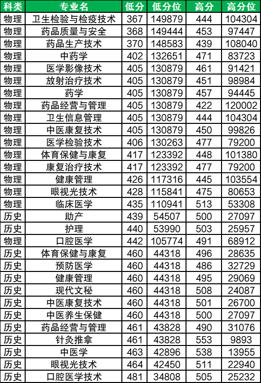 各专业最低分范围在367分-481分之间,其中分数门槛最高的专业是口腔医学技术(历史类)、分数门槛最低的专业是卫生检验与检疫技术(物理类)。