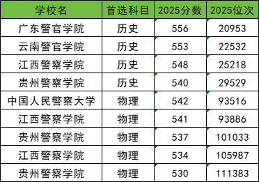 2025年广东历史类公安警校最低录取分数线是540分,收分最低的大学有贵州警察学院;物理类公安警校最低分是530分,收分最低的大学是贵州警察学院。