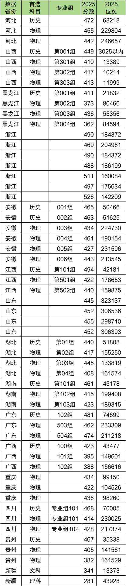 | 首选科目 | 专业组 | 2025分数 | 2025位次 |