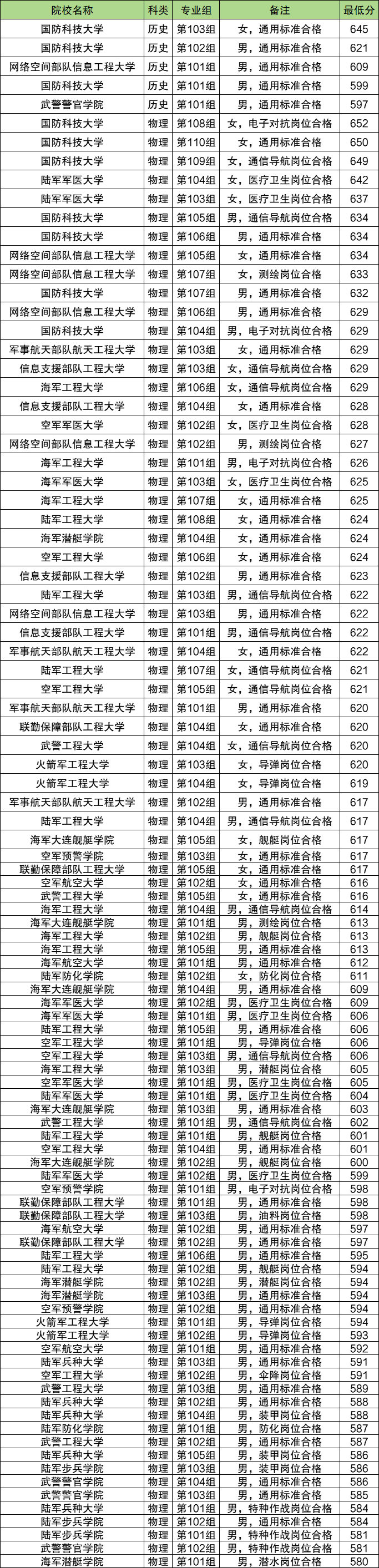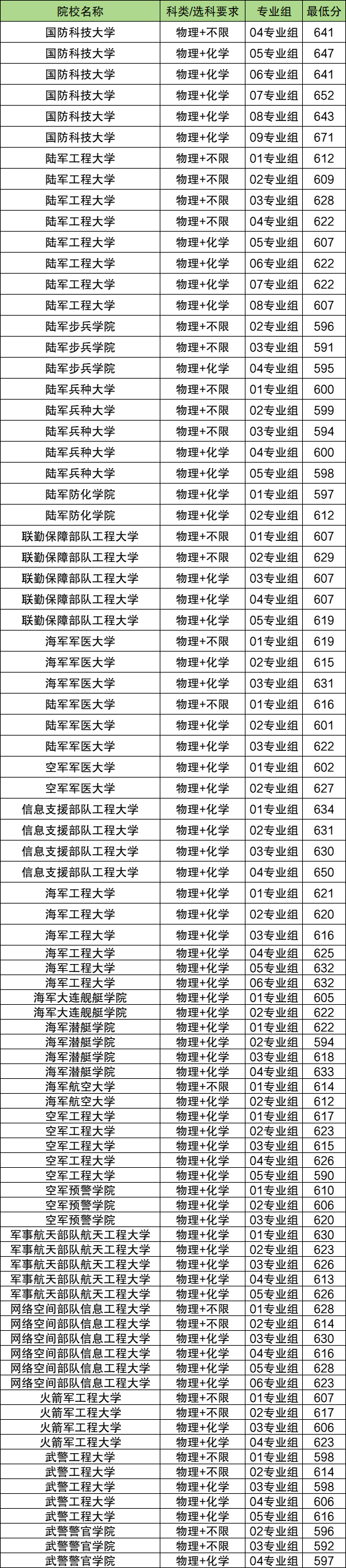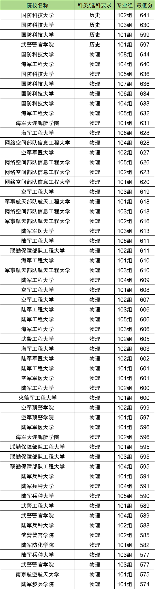 国防科技大学641分、海军大连舰艇学院605分、海军工程大学616分、海军航空大学612分、海军军医大学615分、海军潜艇学院594分、火箭军工程大学606分、军事航天部队航天工程大学613分、空军工程大学590分、空军军医大学602分、空军预警学院606分、联勤保障部队工程大学607分、陆军兵种大学594分、陆军步兵学院591分、陆军防化学院597分、陆军工程大学607分、陆军军医大学601分、网络空间部队信息工程大学614分、武警工程大学598分、武警警官学院592分、信息支援部队工程大学630分。