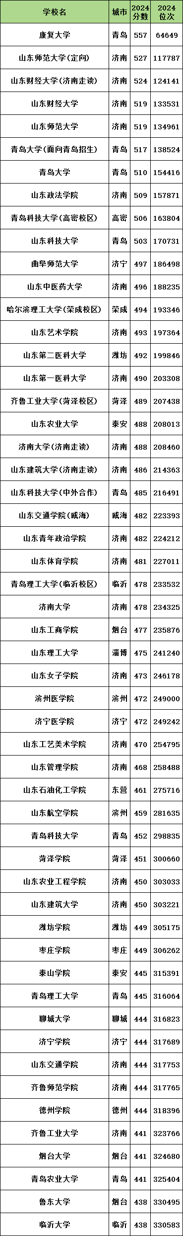 2024年山东公办二本大学录取分数线从438分到557分之间,对应最低排位从64649名到330583名。