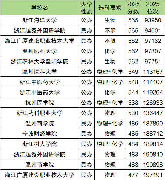 录取分数线最高的是浙江海洋大学(生物),2025年最低分565分,位次93950名;排名前四的还有浙江越秀外国语学院(不限)565分、浙江广厦建设职业技术大学(不限)562分、温州医科大学(化学)562分。