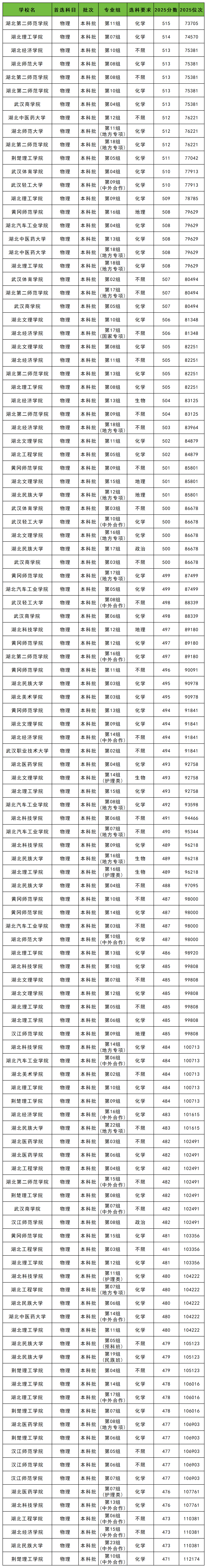 2025年湖北物理类公办二本大学录取分数线从471分到515分之间,对应最低排位从112174名到73705名。