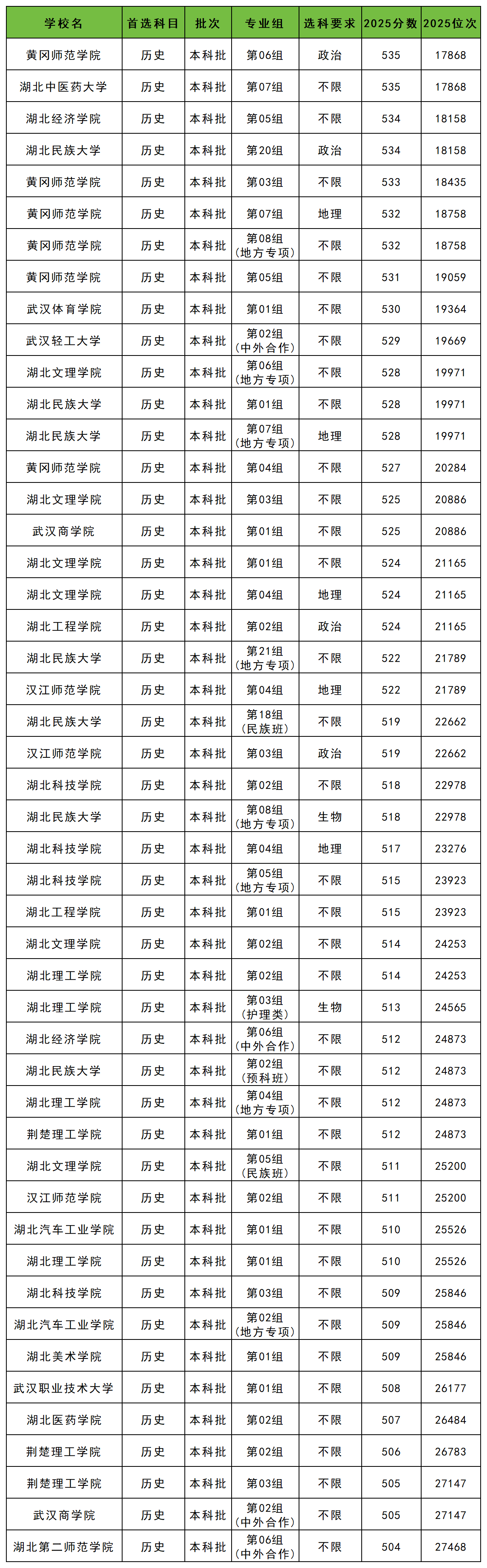 2025年湖北历史类公办二本大学录取分数线从504分到535分之间,对应最低排位从27468名到17868名。
