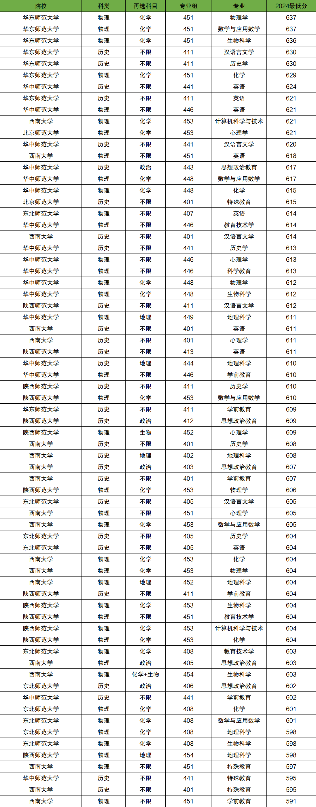 有东北师范大学(历史类最低602分)、华中师范大学(历史类最低595分)、北京师范大学(物理类最低621分)、华东师范大学(历史类最低609分)、西南大学(历史类最低595分)等。