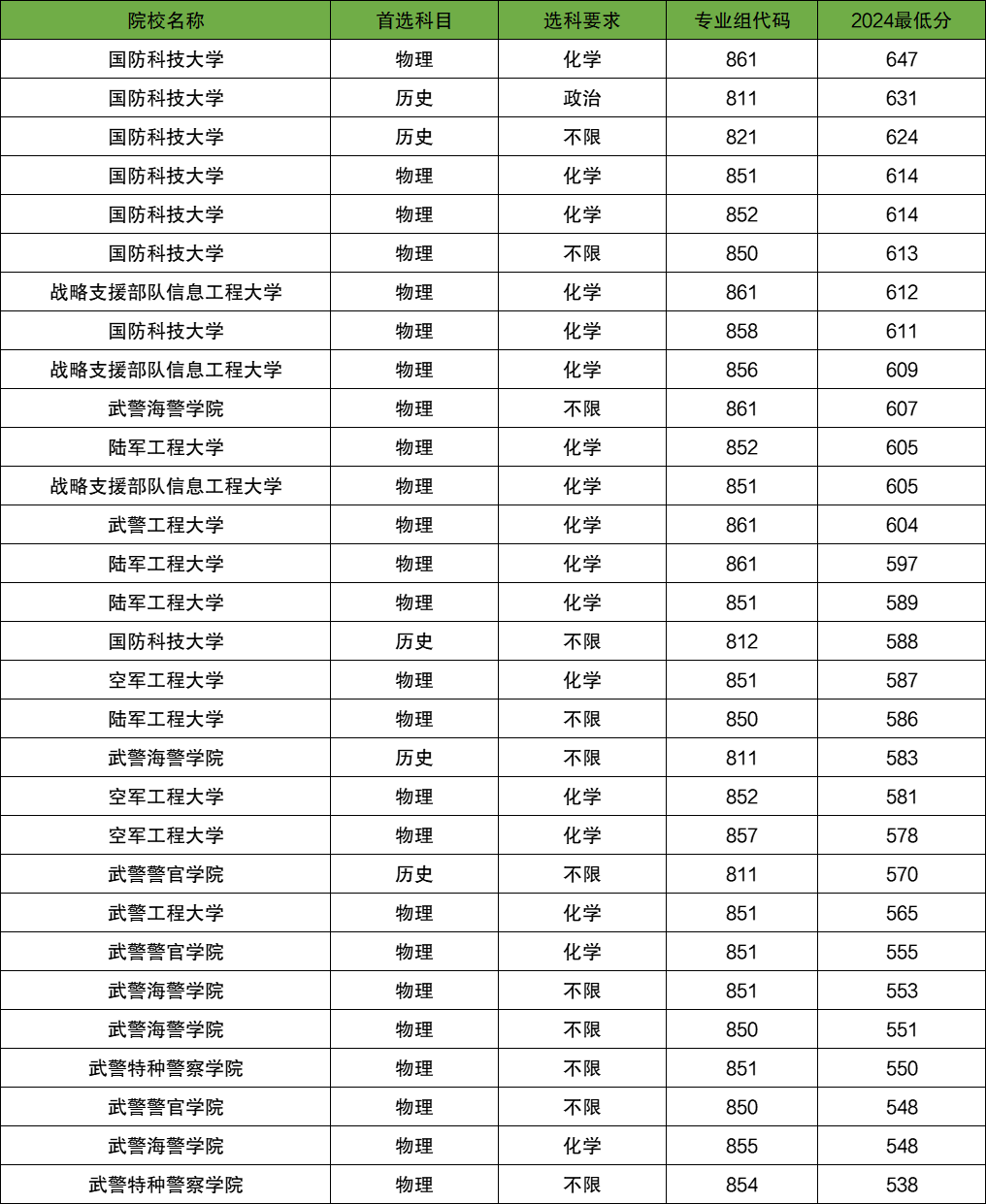 军校有国防科技大学(物理类最低611分)、武警警官学院(物理类最低548分)、空军工程大学(物理类最低578分)、陆军工程大学(物理类最低586分)等。