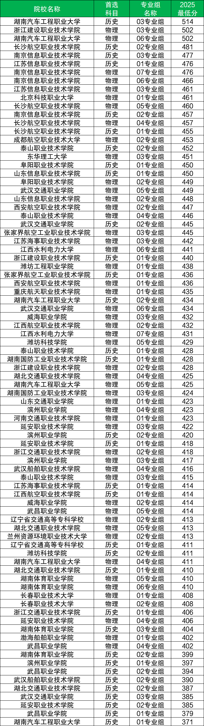 根据2025年江苏招生数据,历史类考生分数至少超专科线151分(即371分)以上、物理类考生分数至少超专科线182分(即402分)以上才有可能会被录取,且录取分数相对较低的院校为武昌职业学院、渤海船舶职业学院。