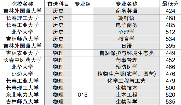 吉林外国语大学商务英语专业是收分最低的地方专项学校及专业,录取分为424分。吉林师范大学汉语言文学专业是收分最高的地方专项学校及专业,录取分为546分。