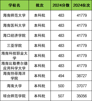 2024年海南民办二本大学最低录取分数为483分,最低分招生位次在第41779名。压线招生的院校有海口经济学院、三亚学院、海南科技职业大学、海南比勒费尔德应用科学大学。