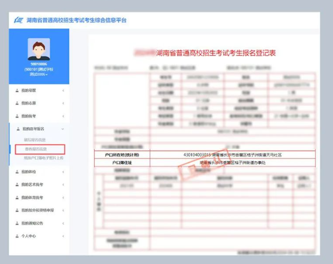 点击【我的高考报名】→【查看报名信息】确认报名信息中,与本人户口簿“户口所在地(统计用)”“户口簿住址”“住址”中的县市区信息是否一致。若有不一致的,考生须在6月16日前,前往高考报名所在县市区招生考试机构完成户籍信息修改,逾期不予受理。